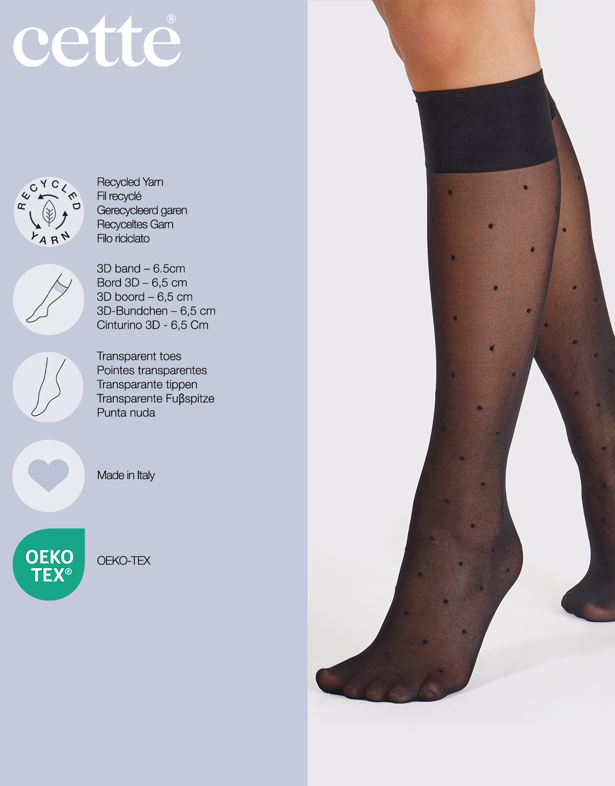 Meie täpilised põlvikud, mis on valmistatud taaskasutatud polüamiidist, on väga pehmed ja mugavad, tänu venivale ribale, mis hoiab neid paigal ilma jalgu pingutamata. Lisaks, täpid rõõmustavad kergesti iga välimust ja need on teie sahtlis kohustuslik muster.