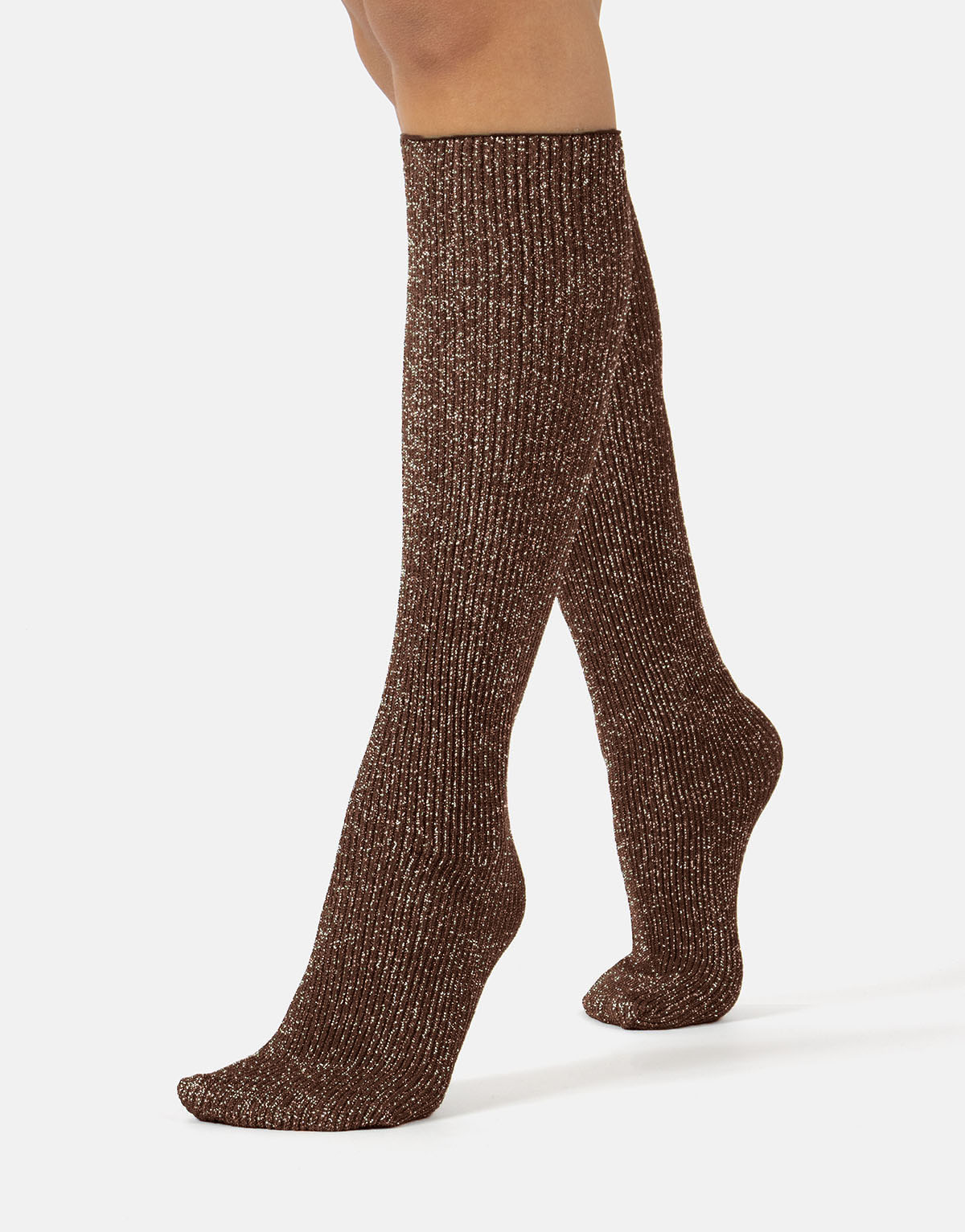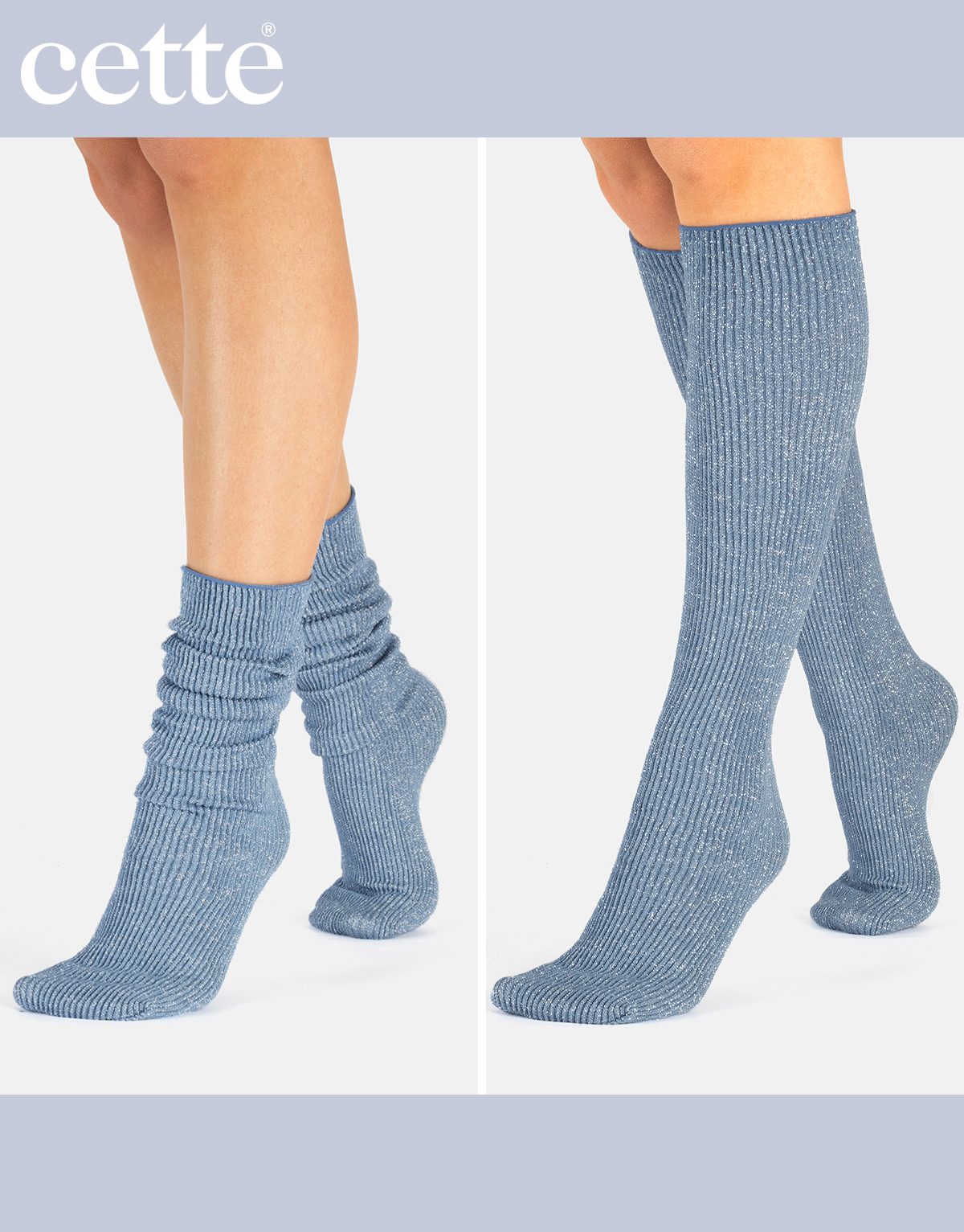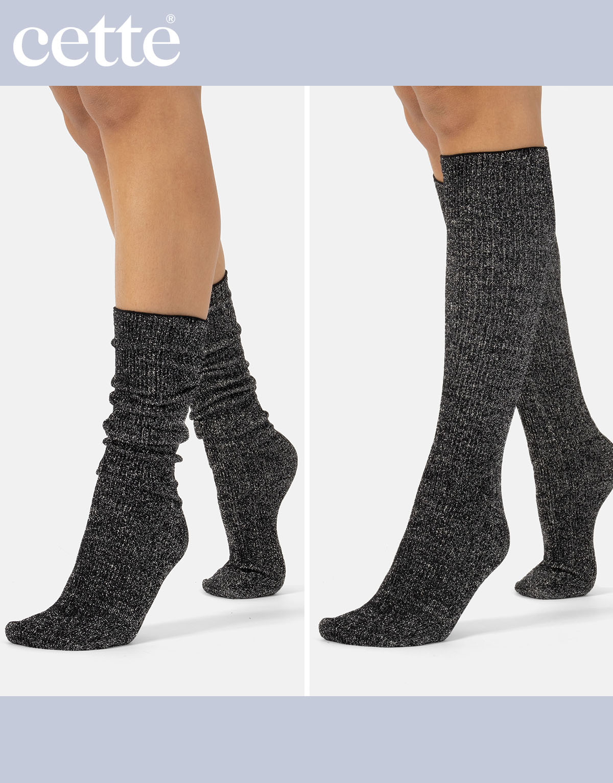 Glamuurne sära nende moesokkide pinnal paneb sind särama nagu täht igal erilisel puhul. Need pikad sokid on rihveldatud mustriga üle kogu jala varvastest kuni ülaosani. Monokromaatiline lõng kohtub hõbedase läikiva lõngaga ja koos loovad nad lummava ja silmapaistva sukandite aksessuaari. Lisaks on need pikad sokid väga mugavad, kuna neil on lahtine ülaosa. Kuna neil ei ole elastset riba, saab neid kanda nii nagu soovid: tõmmata alla raskete voldikute ümber pahkluude või tõmmata üles põlve. Tänu nende venivale ja rihveldatud kangale, kui need on üles tõmmatud, ei kuku need fantastilised sokid, vaid jäävad paika isegi siis, kui sa liigud. Proovi neid kui lahtisi sokke, keeratud pahkluude ümber koos üle mõõtme T-särgiga, et saavutada kena juhuslik välimus, või tõmmata üles elegantse peo välimusega: sa ei jää märkamatuks.