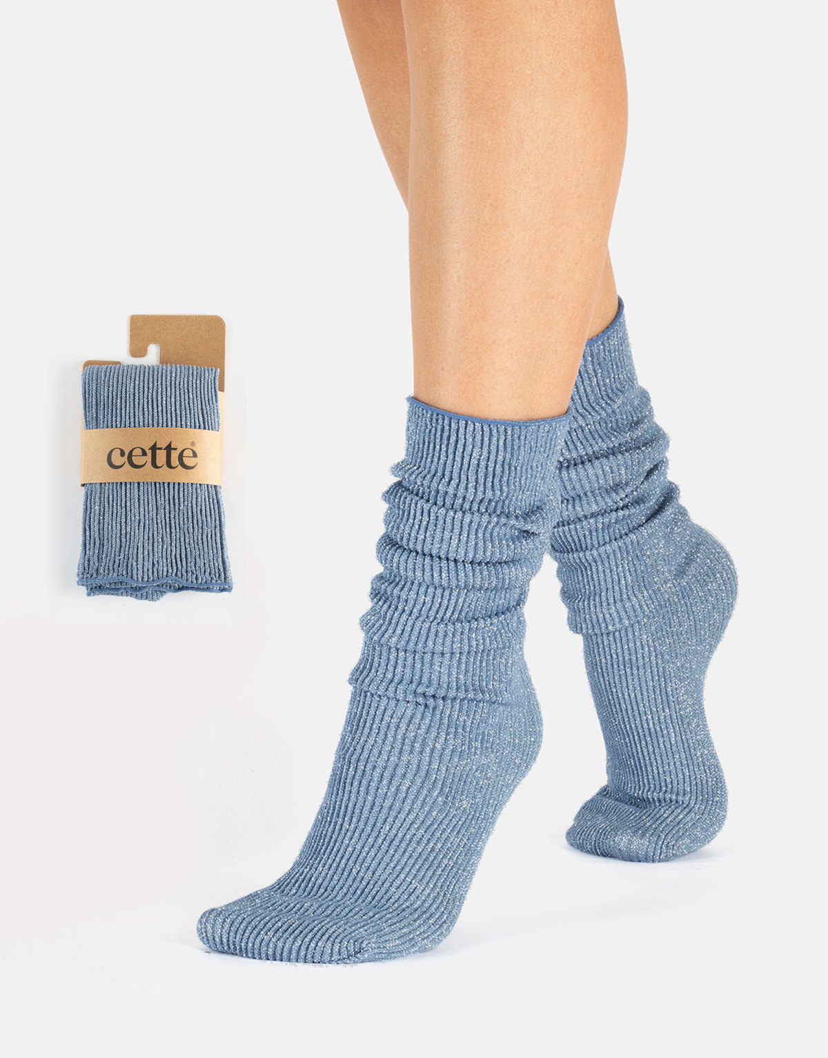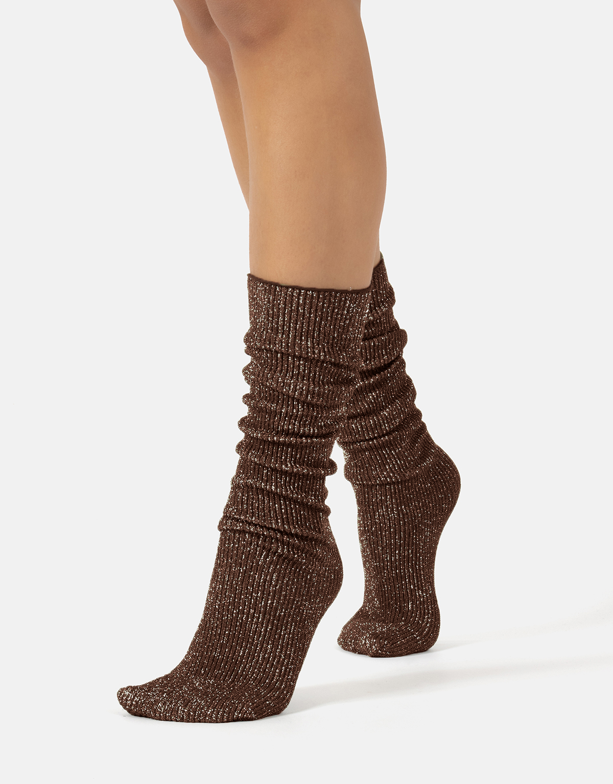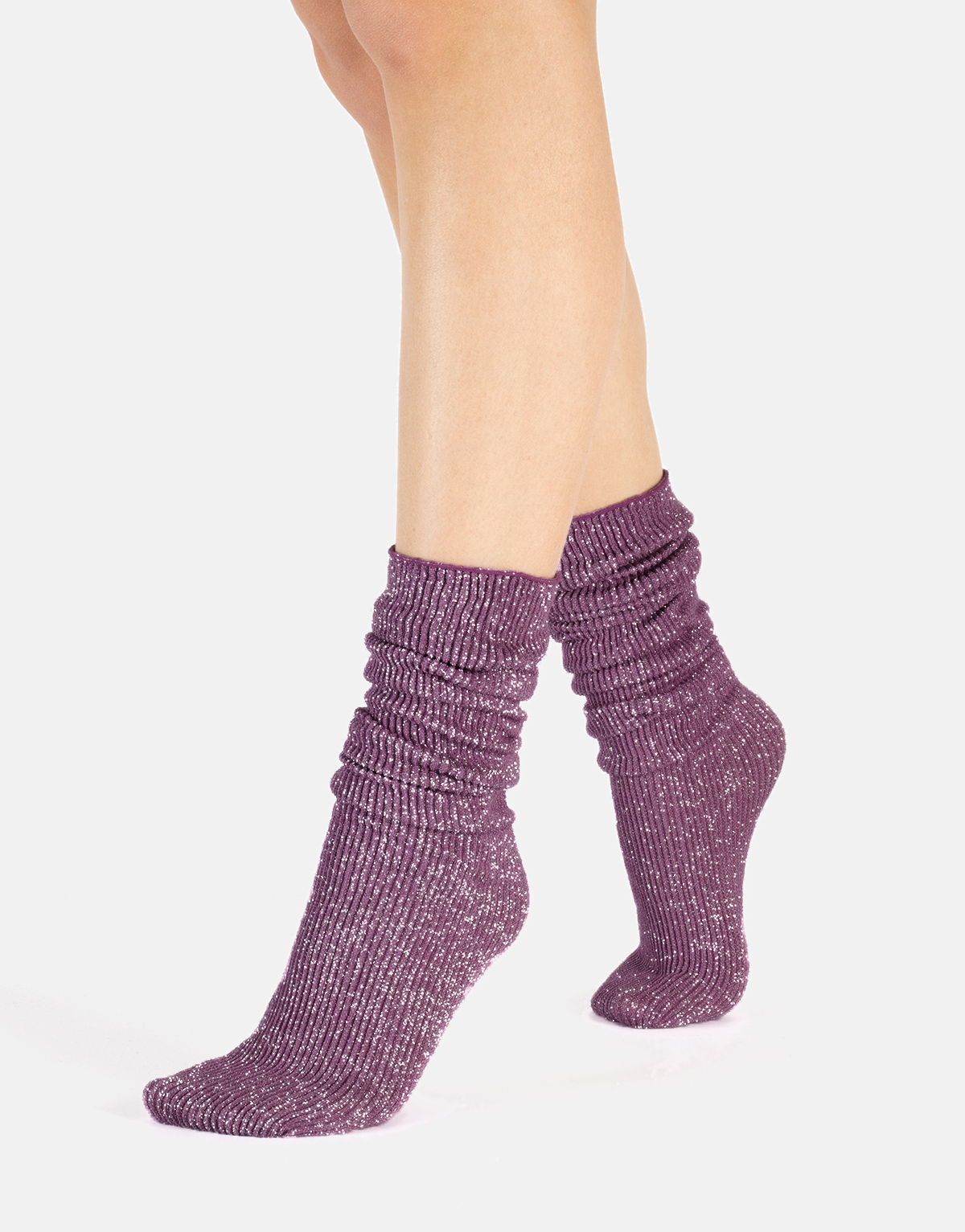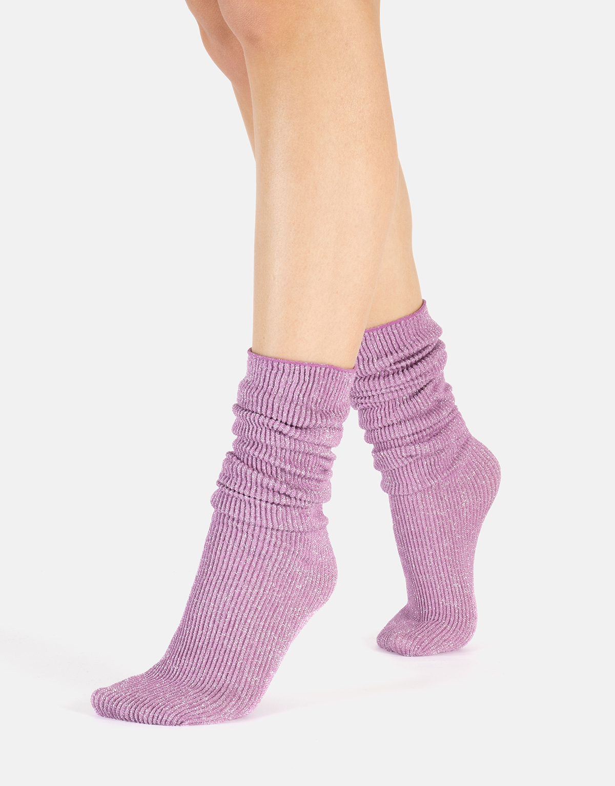 Glamuurne sära nende moesokkide pinnal paneb sind särama nagu täht igal erilisel puhul. Need pikad sokid on rihveldatud mustriga üle kogu jala varvastest kuni ülaosani. Monokromaatiline lõng kohtub hõbedase läikiva lõngaga ja koos loovad nad lummava ja silmapaistva sukandite aksessuaari. Lisaks on need pikad sokid väga mugavad, kuna neil on lahtine ülaosa. Kuna neil ei ole elastset riba, saab neid kanda nii nagu soovid: tõmmata alla raskete voldikute ümber pahkluude või tõmmata üles põlve. Tänu nende venivale ja rihveldatud kangale, kui need on üles tõmmatud, ei kuku need fantastilised sokid, vaid jäävad paika isegi siis, kui sa liigud. Proovi neid kui lahtisi sokke, keeratud pahkluude ümber koos üle mõõtme T-särgiga, et saavutada kena juhuslik välimus, või tõmmata üles elegantse peo välimusega: sa ei jää märkamatuks.