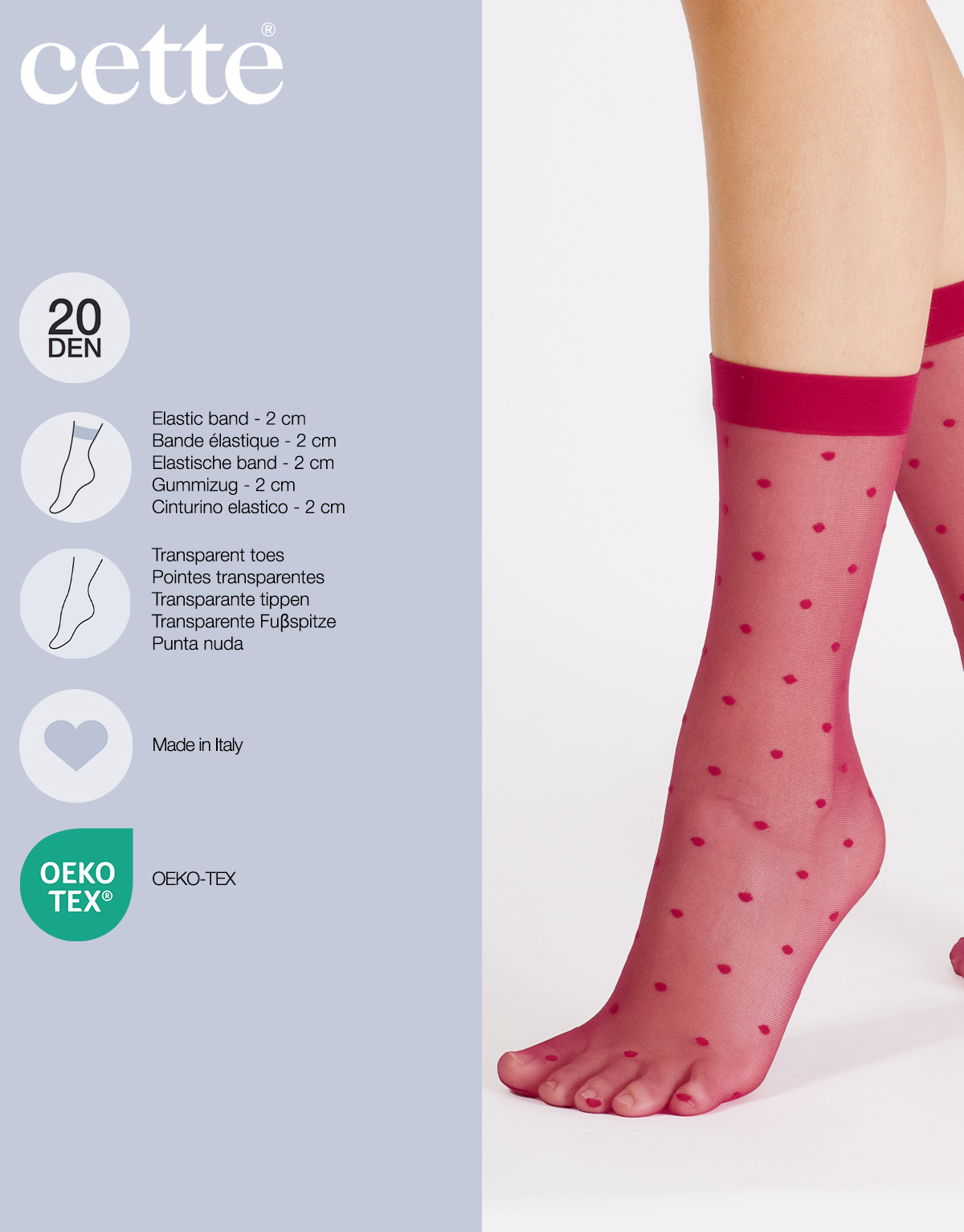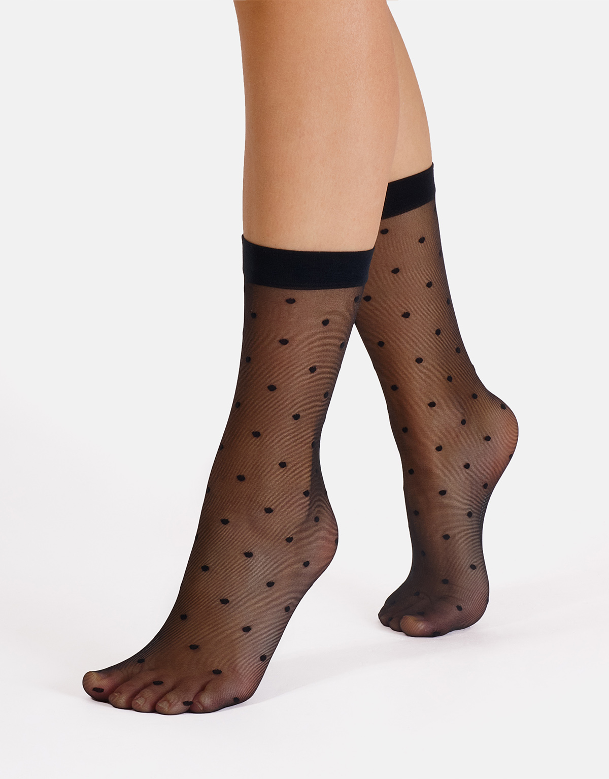 Aksessuaar, mida ei saa teie garderoobist puududa, sukkade must-have on täpilised sokid. Ajatu ja mitmekülgne, see paar täpilisi sokke võib anda igale riietusele kena ja nutika puudutuse. Valmistatud kõrge kvaliteediga Itaalia lõngadest, need 20 den madalad sokid on õhukese tausta peal väikesed läbipaistmatud silmatorkavad täpid. 2 cm laiune elastne riba üle pahkluu on veniv ja mugav: see hoiab sokid paigal, jättes nahale ebamugavaid märke. Need täpilised sokid on läbipaistvate varbaosadega, et saaksite kanda oma lemmik lahtiseid kingi või sandaale. Need õhukesed täpilised sokid saavad iga ürituse ideaalseks kaaslaseks: kas peate elavdama halli äripuku või kui peate täiendama rohkem juhuslikku riietust.