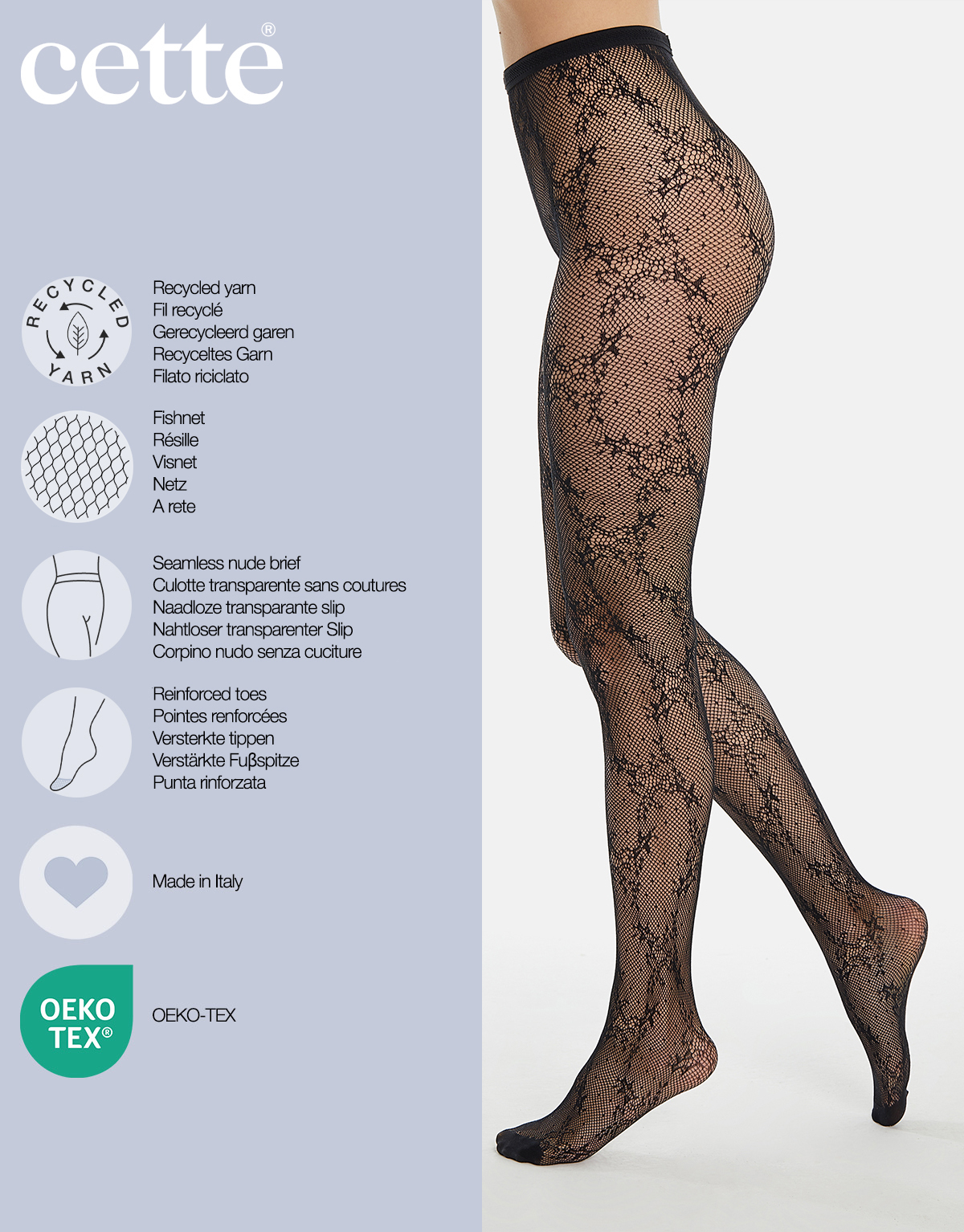 Sa pole kunagi näinud võrksukkpükse nagu need: lummava lillemustriga ja taaskasutatud lõngadest, need on erakordne sukad aksessuaar sinu ja keskkonna jaoks. Täna on eriline öö ja sa valid kanda oma lemmikmust kleit, sa vaatad end peeglist ja... midagi on puudu. Võib-olla paar silmapaistvaid sukkpükse! Võrksukkpüksid on iga sahtli must-have, stiilne igihaljas, mis energiseerib iga välimust lummava võluga. Lisaks on neil võrksukkpükstel lillemuster, mis meenutab Art Nouveau disainilahendusi. Unikaalne kunstiteos, need on valmistatud ka taaskasutatud polüamiidist, parema stiili ja parema maailma nimel. Tugevdatud varbaosadega, et vältida auke ja jooksusilmi, need võrksukkpüksid on õmblusteta, et tagada sinu igapäevane parim mugavus.