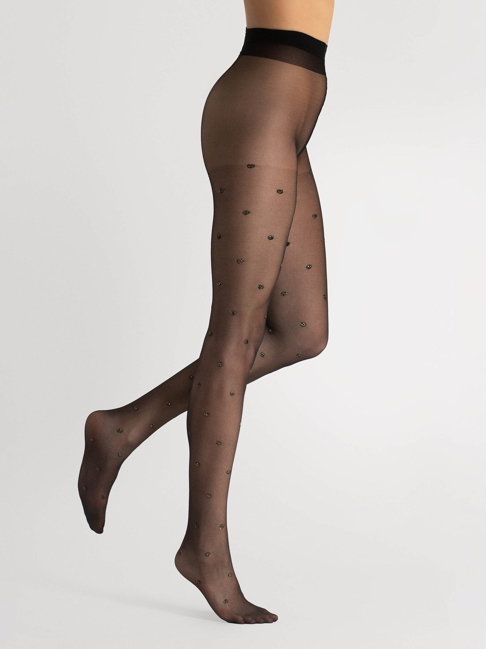20 den sukkpüksid sätendava Lurex täppmustriga, tugevduseta püksiosaga, lahtise varbaosaga.