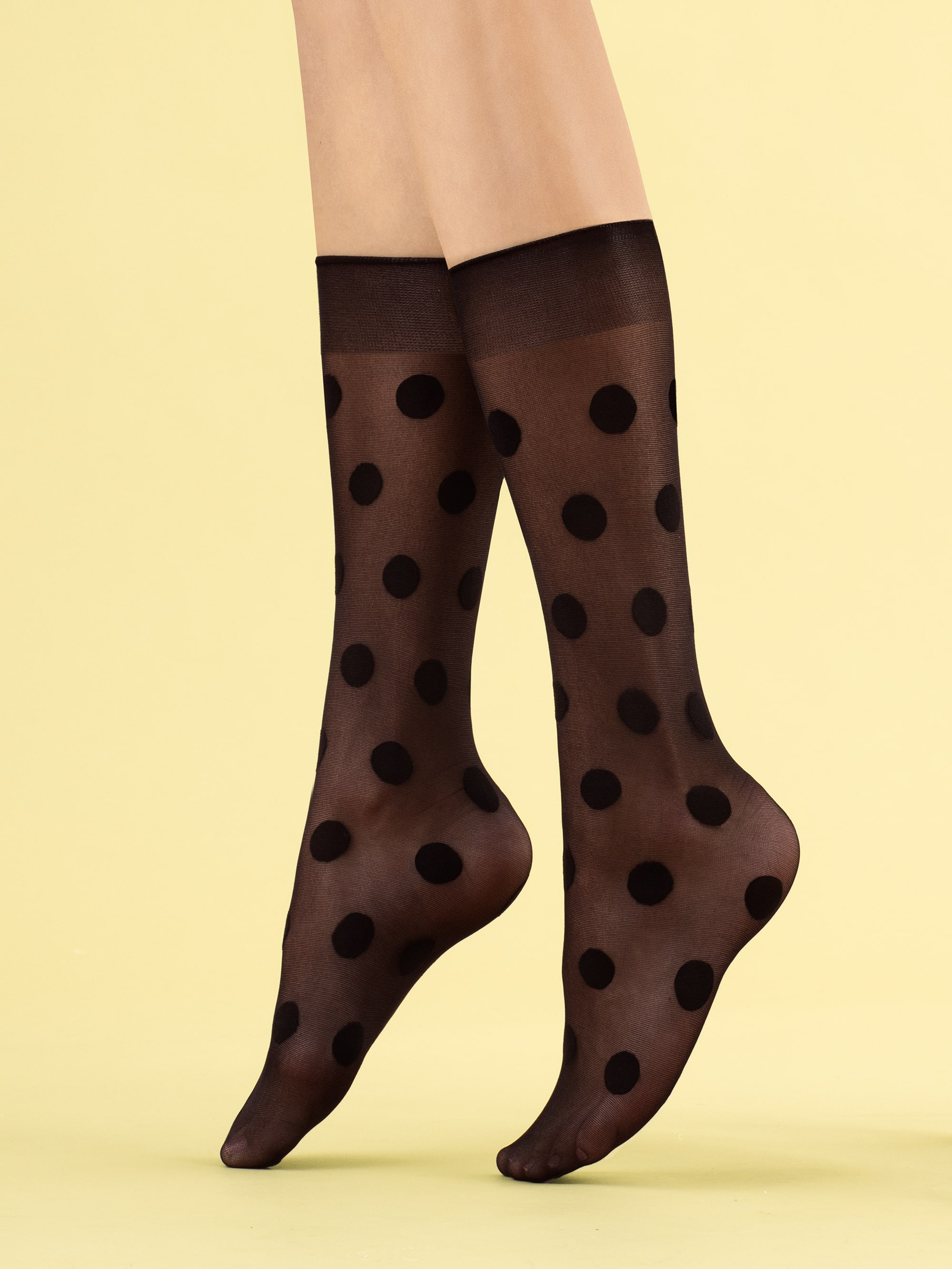 8 den sukkpüksid trendika täppide mustriga põlvikud, millel on õhuke, mitte-surve bänd ja nähtamatult tugevdatud varbaosa. Toode on valmistatud 3D tehnoloogias, kõrgeima kvaliteediga kaetud lõngadest, et suurendada vastupidavust.