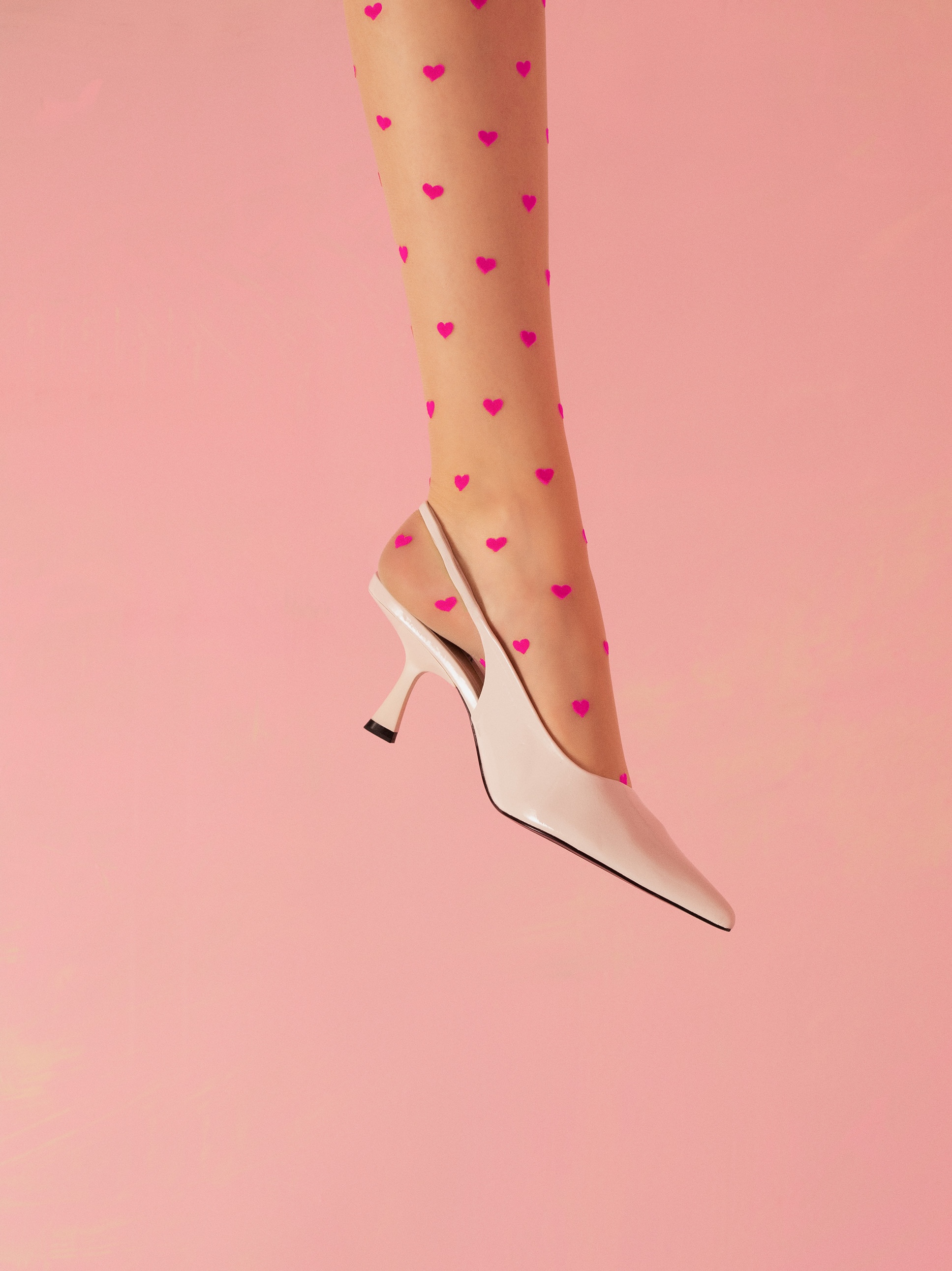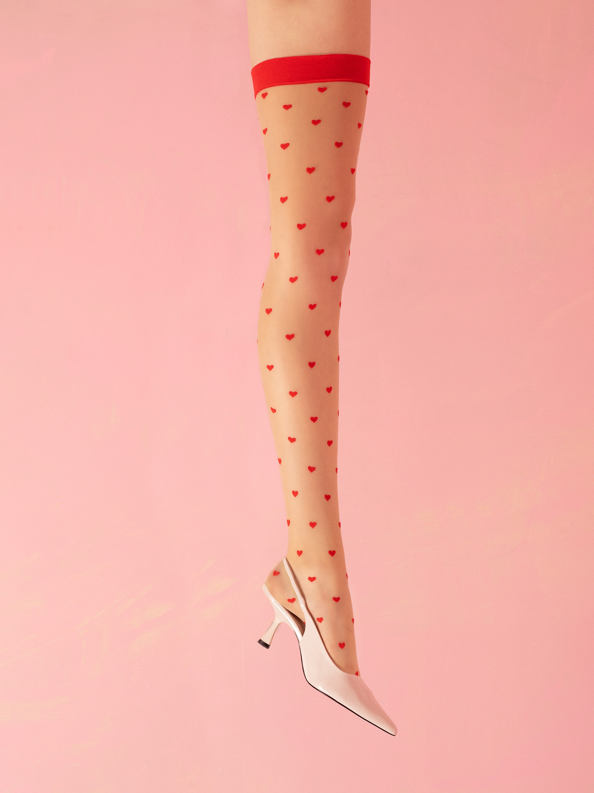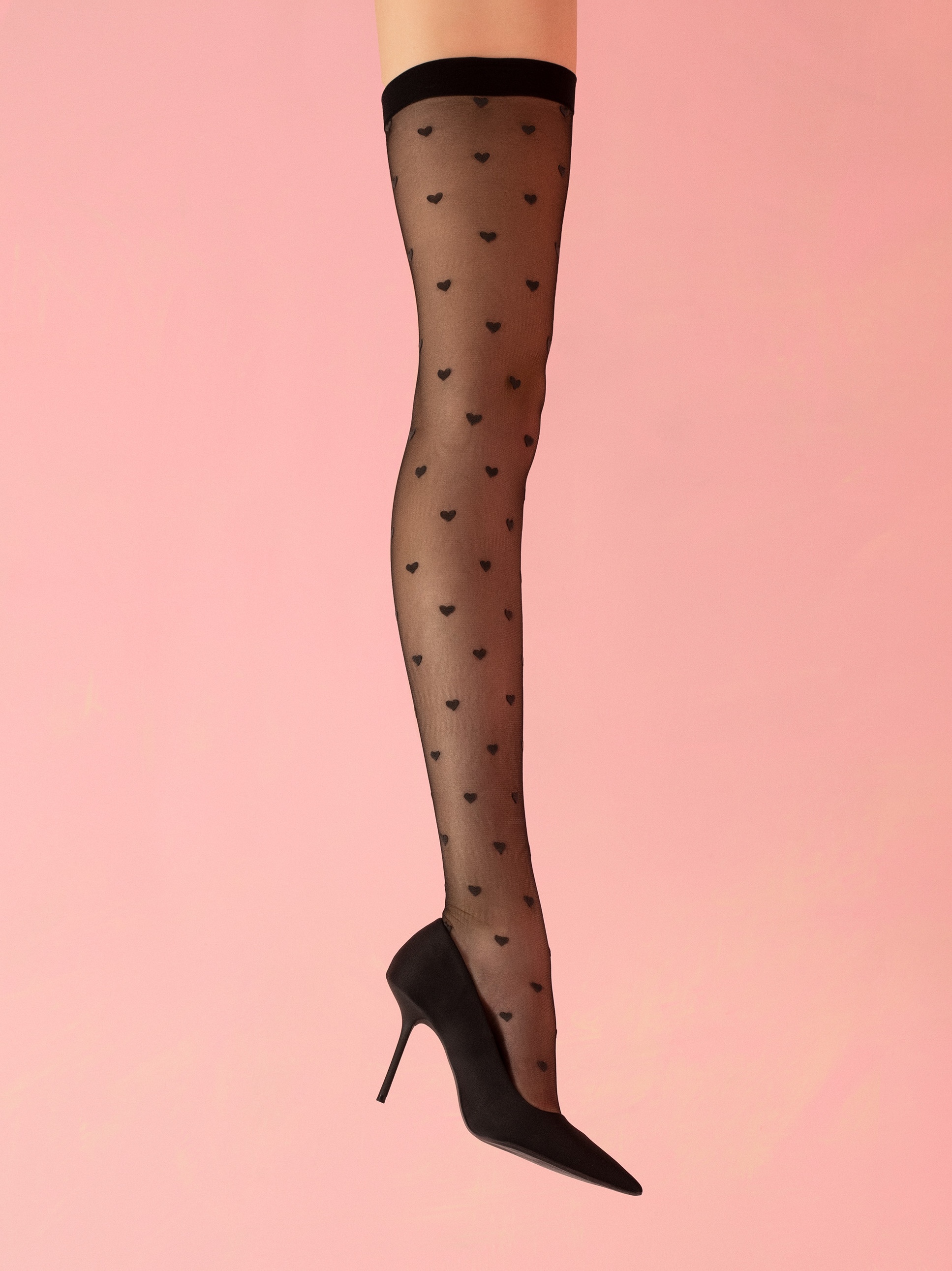 Õhukesed sukad südame mustriga kontrastsetes värvides, nähtamatult tugevdatud varbaosad ja lamedad õmblused, täiesti nähtamatud kõige lähedasemate riiete all.
