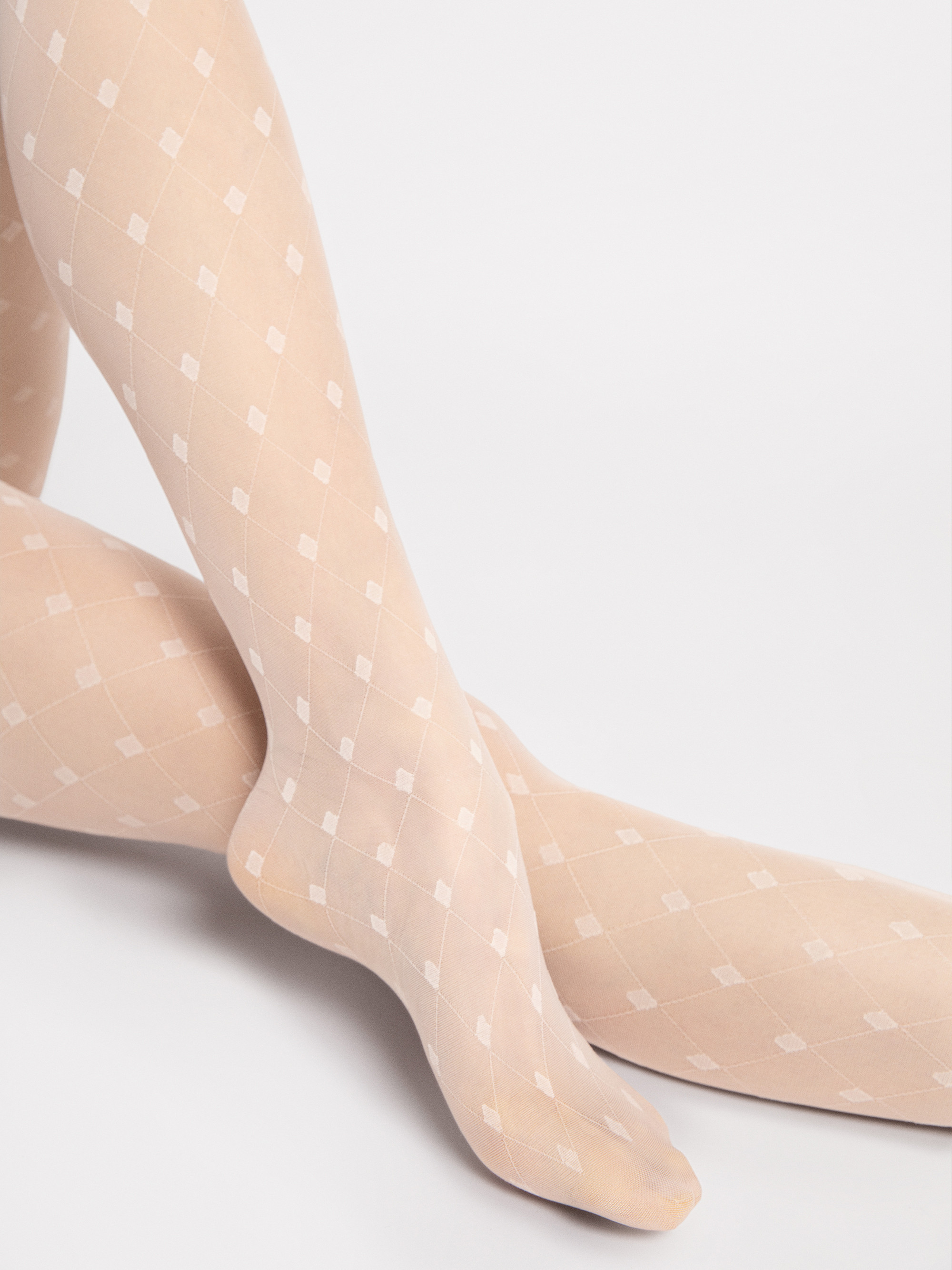 Elegantne sukkpüksid, millel on täpiline muster väikestest teemantidest, mis on korrapäraselt paigutatud disaini, mis meenutab võrksukkpükse suurte avadega. Matt sukkpüksid, millel on vintage-stiilis motiiv.