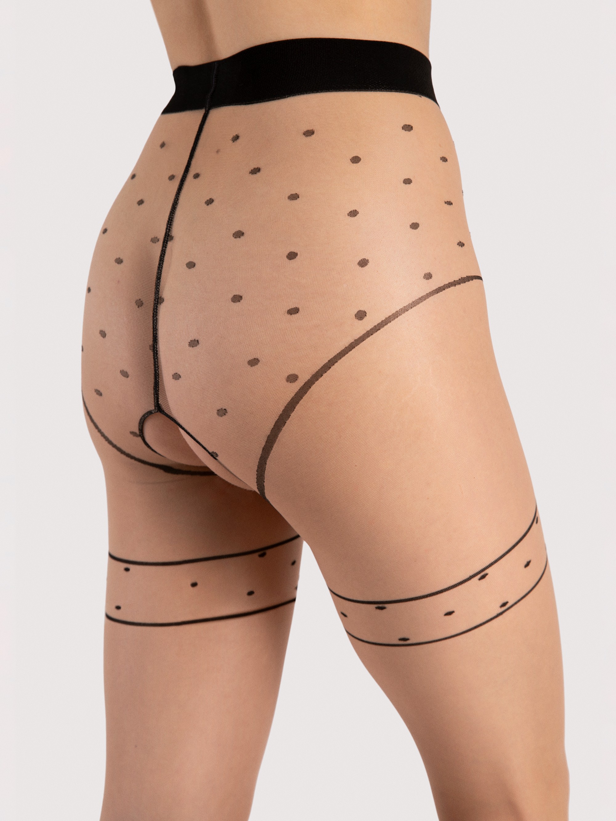 Sensuaalsed sukkpüksid sukapaelavöö efektiga avatud jalgevahega ja täpilise mustriga, 20 denier.