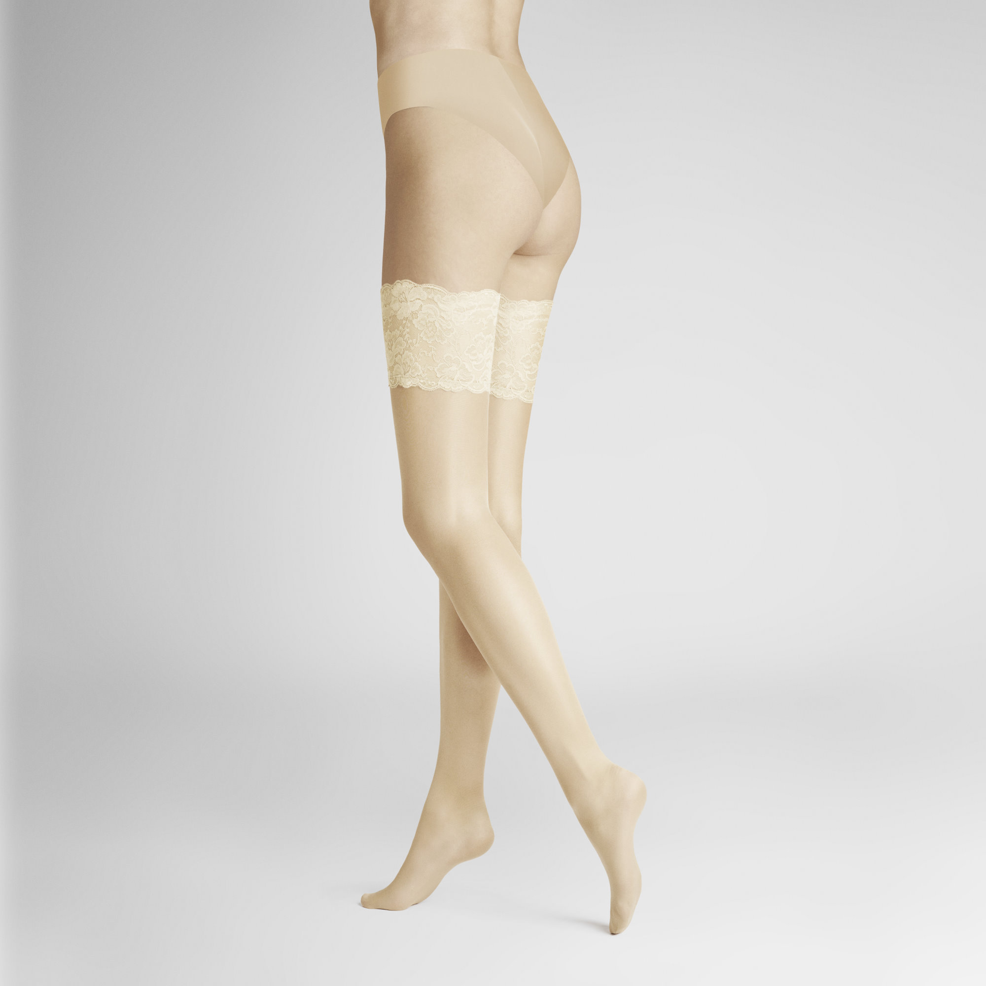 Elegantne läikiv, ideaalne erilisteks puhkudeks - Läbipaistev ja läikiv isidiveeruv sukad kauni lillemustriga pitsiservaga, kahekordsete silikoonlintidega ideaalse hoidmise jaoks, läbipaistev peast varvasteni, läbipaistev tugevdatud varbaosa lamedate õmblustega, 23 den.