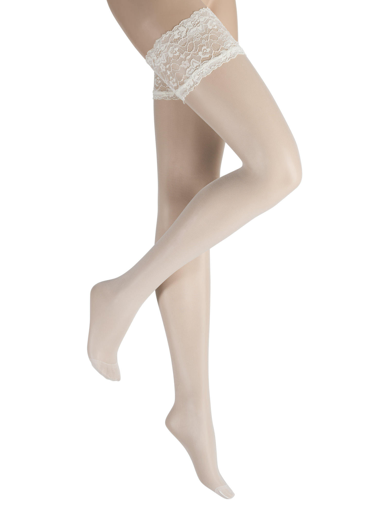 Elegant, ultra sheer hold ups with romantic, ruched lace top, with soft flat seam and two silicone-stripes for a perfect hold, shadow toe with soft flat seam.