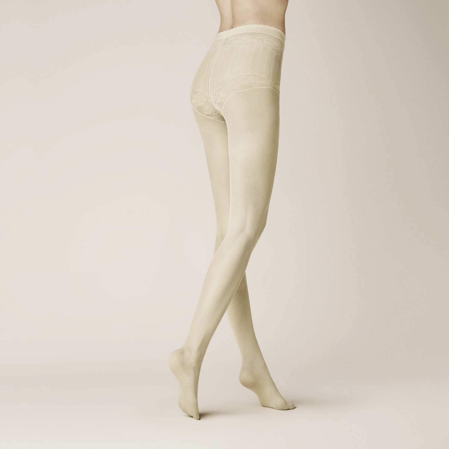 Sukkpüksid poolläbipaistvad, matt - Paar sukkpükse on puhas naiselikkus ja pesu välimus on naiste rõivaste põhielement. Pitsbluusid, heegeldatud kleidid ja läbipaistvad sisetükid bluuside ja seelikute jaoks on näidatud. Iga naine tunneb end nendes sukkpükstes naiselikuna, millel on peene võrkmuster ja elegantse mustriga püksiosa.