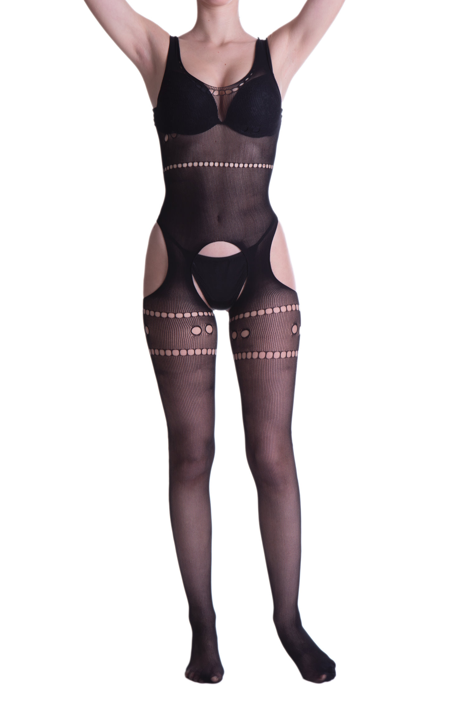Pehme kalasaba bodystocking sensuaalsete lõigetega ja keeruka mustriga.